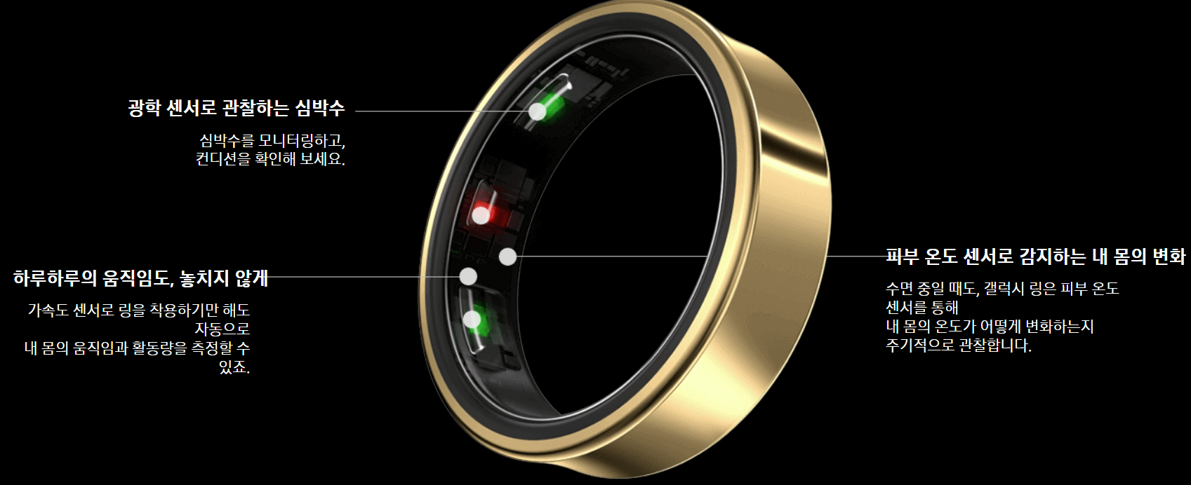 개인 건강의 시작인 수면에 초점을 맞춘 갤럭시 링은 더욱 고도화된 수면 분석과 강력해진 수면 알고리즘을 통해 사용자가 자신의 수면을 이해하고 수면 습관을 개선하도록 돕습니다.