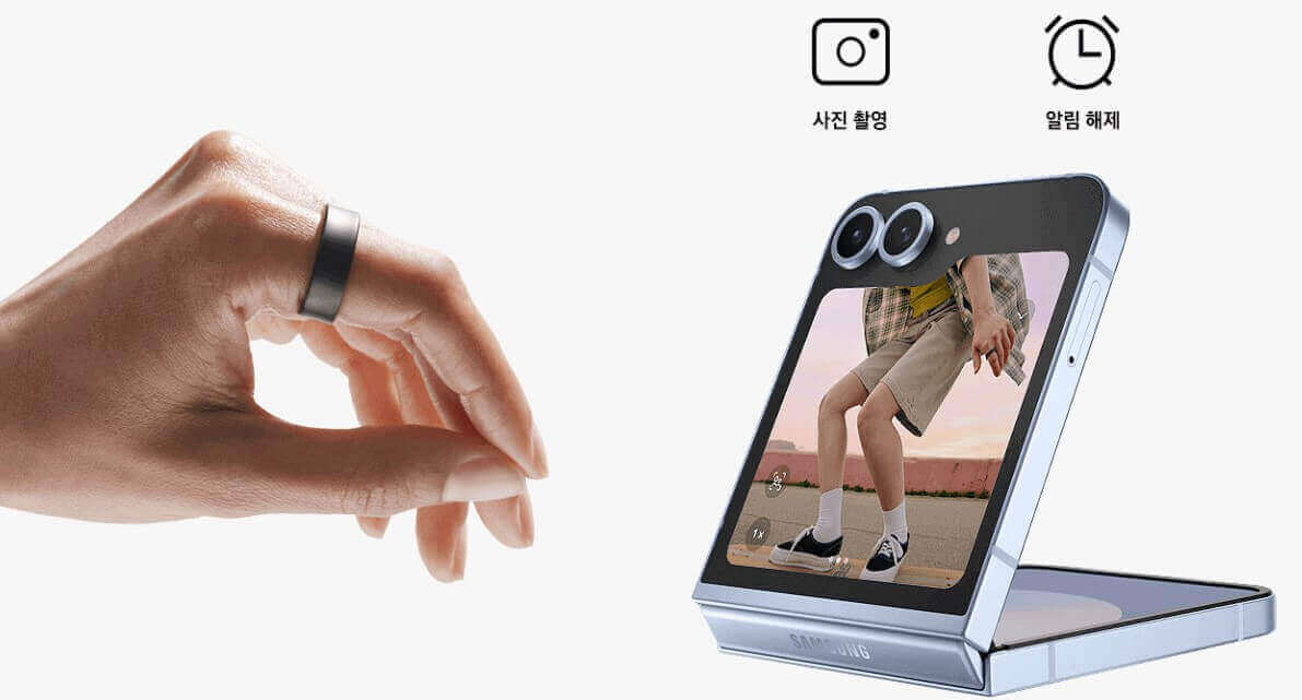 갤럭시 링을 착용하고 스마트폰과 연결하면 카메라 촬영이 가능합니다. 촬영 방법은 갤럭시 링을 낀 손가락과 엄지를 더블클릭(더블핀치)하듯이 빠르게 부딪히면 먼 거리에서도 촬영을 할 수 있습니다.