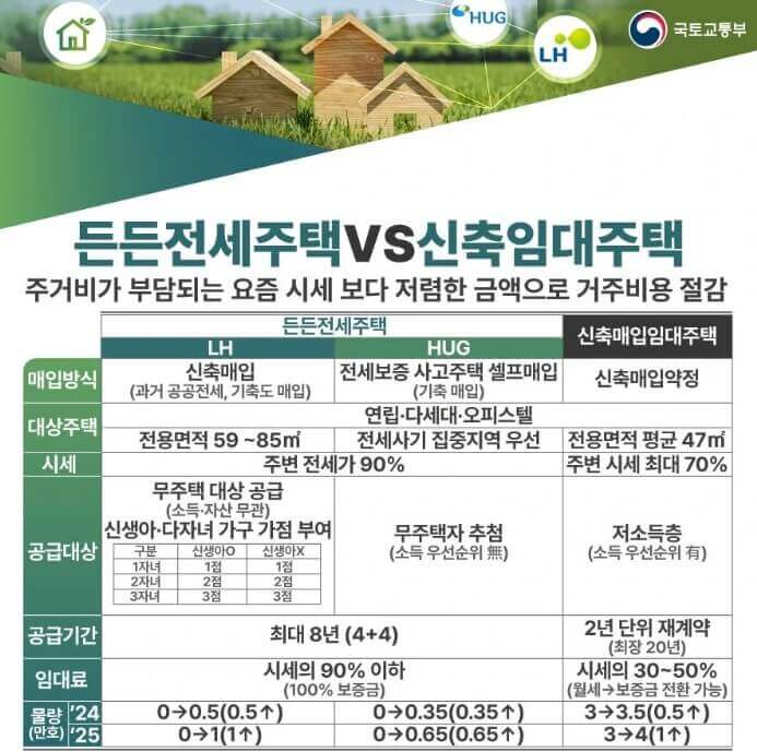 3∼4인가구가 쾌적하게 생활할 수 있도록 전용면적 60~85㎡의 신축 주택을 2024년에는 5,000호, 2025년에는 1만호를 매입하여 공급할 예정입니다.