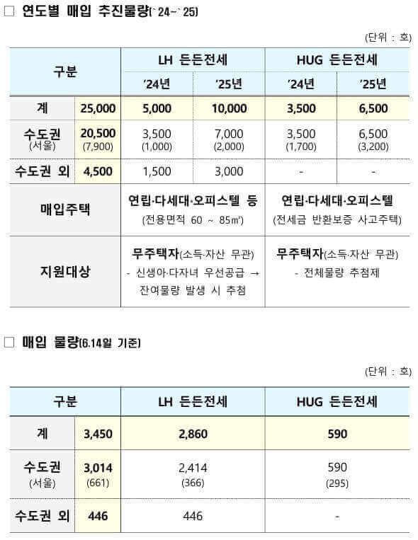 집주인을 대신해서 전세금을 돌려주고 경매 신청한 주택을 HUG가 직접 낙찰받아 2024년에는 3.5천호, 2025년에는 6.5천호를 매입하여 공급할 예정입니다.