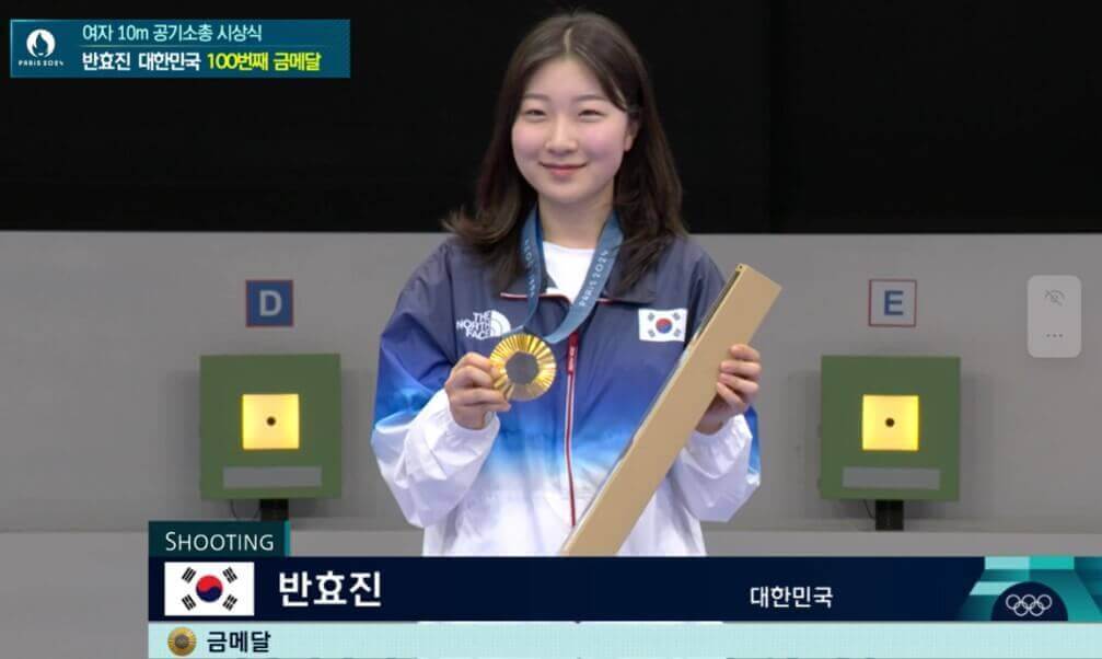 한국 사격 대표팀 역대 최연소 선수인 16세 나이 반효진이 파리올림픽에서 우리나라 하계 올림픽 역대 100번째 금메달 주인공이 됐습니다. 반효진은 7월 29일 열린 사격 공기소총 10m 여자 결선에서 슛오프까지 가는 접전 끝에 금메달을 목에 걸었습니다.