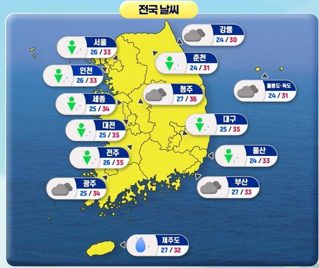 낮 최고기온은 서울 33도, 춘천 31도, 대전, 대구 35도, 광주 34도, 제주 32도로 어제와 비슷하겠습니다.
