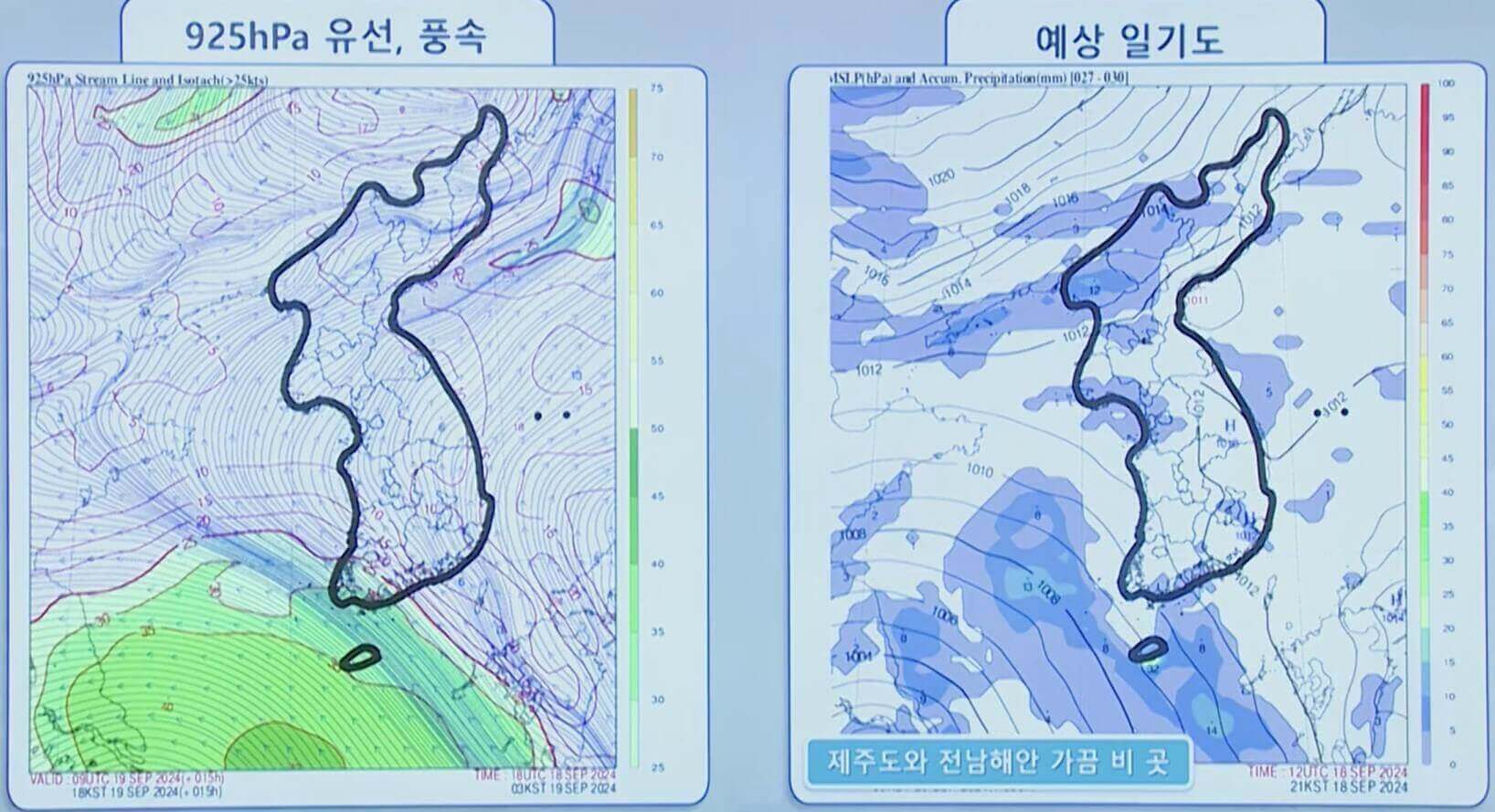 대기 상공 800m 부근 유선, 풍속 일기도입니다. 제주도는 녹색 계열로 표시된 강한 바람이 부는 지역에 위치해 있는 것을 알 수 있습니다.