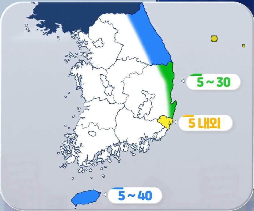 예상 강수량은 강원도 9월 23일까지 강원영동 5~40mm, 경상권 경북 동해안, 경북 북동산지 5~30mm, 울산, 울릉도, 독도 5mm 내외, 제주도 9월 23일까지 5~40mm가 내리겠습니다.