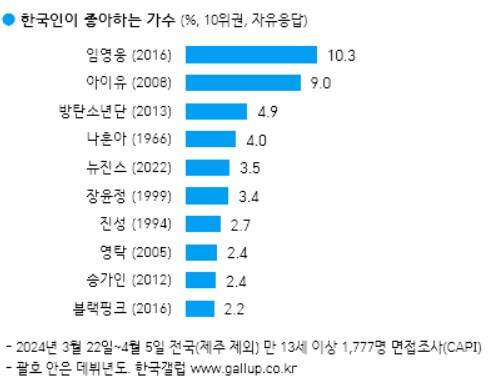 임영웅이 한국갤럽이 2024년 3월 22일부터 4월 5일까지 전국(제주 제외) 만 13세 이상 1,777명에게 한국인이 가장 좋아하는 가수를 물은 결과 10.3%를 차지해 9.0%를 차지한 아이유와 4.9%를 차지한 방탄소년단을 따돌리고 당당히 1위를 차지했습니다.