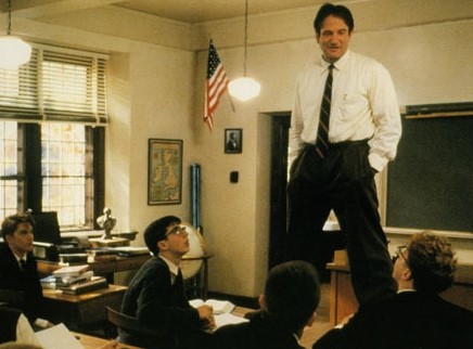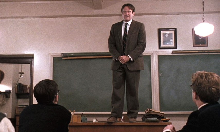 ‘죽은 시인의 사회’에서 가장 가슴 아픈 순간 중 하나는 클라이맥스 장면으로 학생들이 비정통적인 방법으로 퇴학당할 위기에 처한 키팅과의 연대를 보여주기 위해 책상 위에 서 있는 장면입니다. 이 강력한 반항 행위에서 그들은 결과에 관계없이 진정성과 성실성의 삶을 살겠다는 약속을 확인합니다. 그것은 자기 자신을 변화시키는 힘과 역경에 직면하여 진정한 행복을 추구하는 것에 대한 의지입니다.