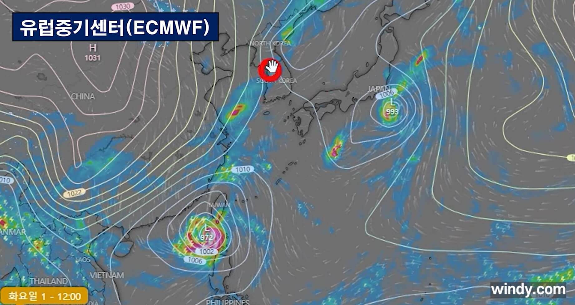 태풍이 북상해 올라오다가 태풍의 등압선이 사라지는 모델도 있고 태풍의 이동 속도가 매우 느려서 그 자리에서 멀리 가지 못하는 모델도 있습니다